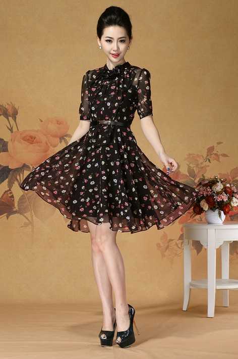 7、优雅气质木耳边修身雪纺印花连衣裙