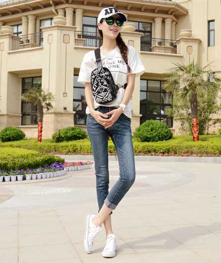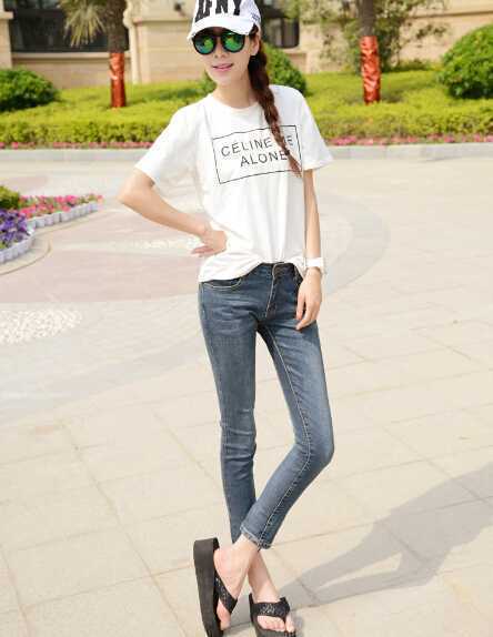 夏季紧身牛仔九分裤,经典不失时尚,束腰搭配简约T恤衫,很随性休闲,加上墨镜和帽子,高温户外游玩不惧怕晒。