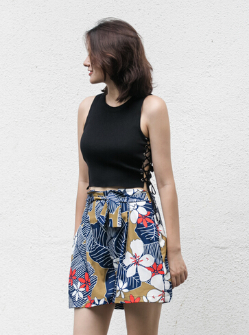 【高腰短裤款式01】这款符合夏日清凉感的花色高腰短裤绝对是秀大长腿的好选择喔!阔边的裤脚设计又能带有一点裙子的感觉,腰头系带可以根据身形而随意绑,配上简单纯色的上衣就能出门了喔!