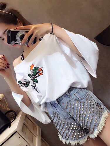【高腰短裤款式03】这款韩版的高腰短裤十分地特别,在经典的牛仔短裤的基础上添加了花朵刺绣的图案,改变了以往牛仔短裤的传统样式。整个高腰款式都变得十分有特色且优美好看,瞬间就能引起别人的注意。