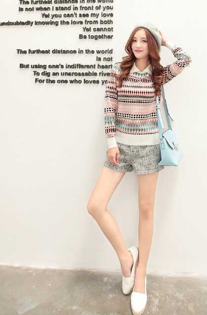 柔软面料无拘束感的锦纶套头针织衫,复古宫廷式的风格,是毛呢短裤的最好搭档。适当佩戴上顶帽子,营造复古唯美感。
