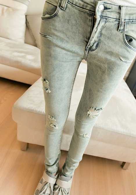 欧美春季破洞小脚裤