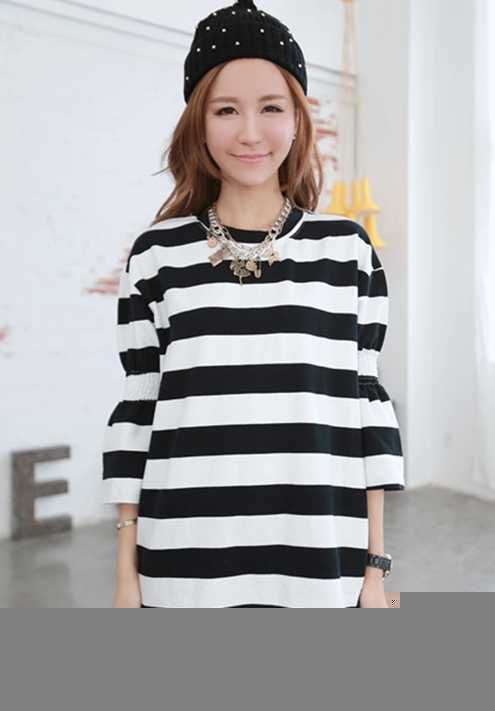 经典圆领春季黑白长款T恤,帅气又不失时尚感,还不挑人穿的款式呢,独特设计的喇叭袖,凸显时尚感。