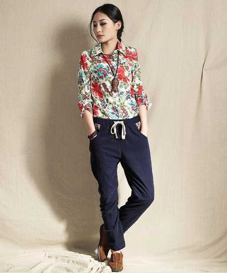 休闲文艺范的春季小碎花雪纺衬衫,随性时尚感,搭配休闲藏蓝色裤子,穿出时尚文艺范春装,彰显淑女气质。