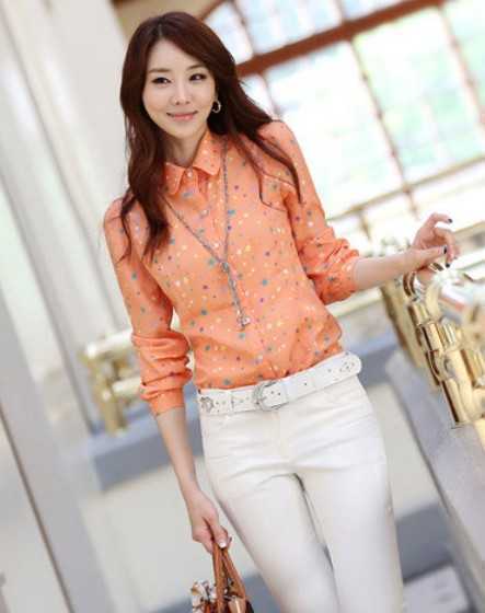 橙色是一种亮眼的色彩,特别是春季衣橱必备的橙色衬衣,更是时尚亮眼夺目了,随意搭配纯白色紧身裤,完美展现出玲珑有致好身材。