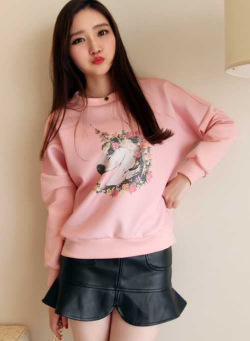 糖果粉色春季套头卫衣,粉嫩的颜色是许多女生们的最爱,精美的小马图案,增添时尚感,随意搭配短裤都很百搭好看。