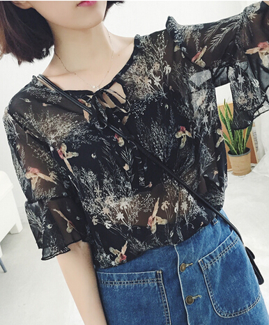 雪纺衫款式04》》》》》韩版类型的雪纺衫总能受到女生们的青睐。细碎的款式图案简单自然,宽松的版型轻松显瘦,而袖口处采取了花朵型的灵感设计,让整件雪纺衫更显甜美淑女范,演绎着温柔与优雅的时尚感。