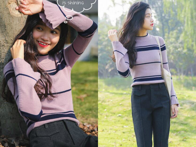 香芋色可以凸显好气色,撞色的条纹设计修身显瘦,喇叭袖的基础上加入荷叶边元素,简约中展现时尚的一面,把毛衣下摆束进小脚西裤里,把女生的好身材展现得淋漓尽致之余更显知性大方气质。