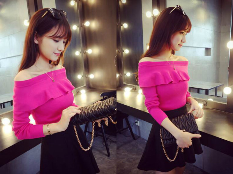 一字领的设计使女生的锁骨露出来显得性感迷人,胸前荷叶边的围边增添甜美感,加上鲜艳的玫红色更是显得女生皮肤白皙,搭配黑色高腰短裙尽显好身材,如果不喜欢一字领的话也可以把肩膀收起来哦!