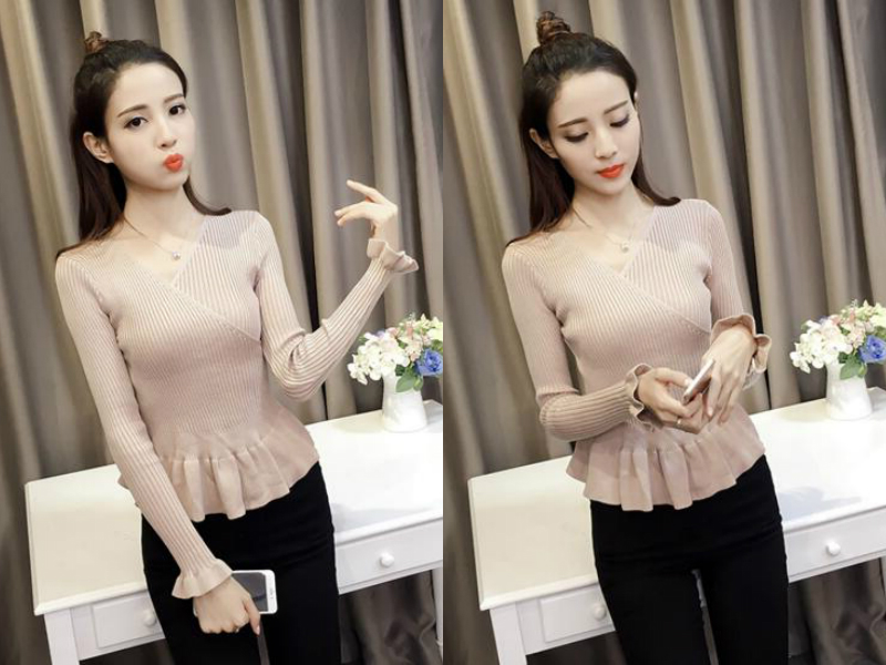 这款荷叶边毛衣的设计非常修身,V领设计很性感,衣服下摆荷叶边遮肉显瘦,对于有小肚子的妹子来说是个不错的选择。亲肤的裸色让女生举手投足间都散发出优雅气息,搭配黑色紧身裤简约耐看。