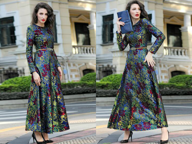 这是一款充满欧美大气风的蕾丝长裙,整条裙子的花纹虽繁杂却不会觉得凌乱,外层的黑色蕾丝与裙子上的花朵重叠在一起,显得很复古,长至脚踝的裙摆让女生显得很高,再在腰线出系上一条细细的腰带,整个人更显修长了,强大的气场呼之欲出。