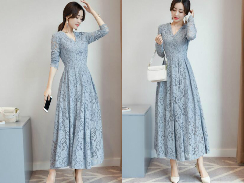 如果你的腰足够细,那就一定要试试这款蕾丝长裙了,它的收腰设计可以恰到好处的展现女生的小蛮腰,V领设计拉长脖子线条之余还能让你更显性感,加上裙子上分布均匀的蕾丝花圈,女生的女人味就更加浓郁了。