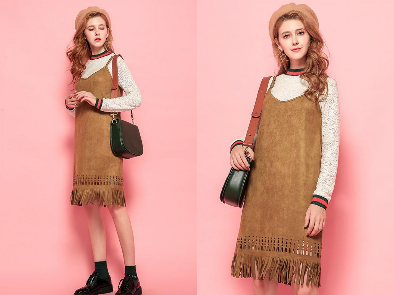 吊带设计的连衣裙对于肩部细窄的妹子来说是个不错的选择,细细的吊带有助于修饰肩膀比例,使肩膀看起来更优美。仿鹿皮的材质看起来很高档,H型的裙身不挑身材,就算有小肚子也可以很好的遮掩,长至膝盖更是可以修身显高,裙摆上的格子镂空加流苏设计,增添复古气息之余更使这条连衣裙变得清新而时尚。