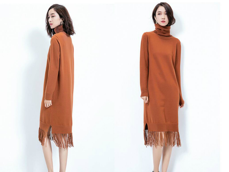 针织的料子柔软亲肤,弹性大让你活动起来更自如,宽松的高领设计搭配裙子的长度让妹子身形显得更加修长,精致的肩部裁剪贴合双肩,显得优雅时尚,裙摆上密密的流苏轻轻贴着小腿,为裙子带来一丝灵动美,冬天不管外搭一件大衣或羽绒服都很OK。