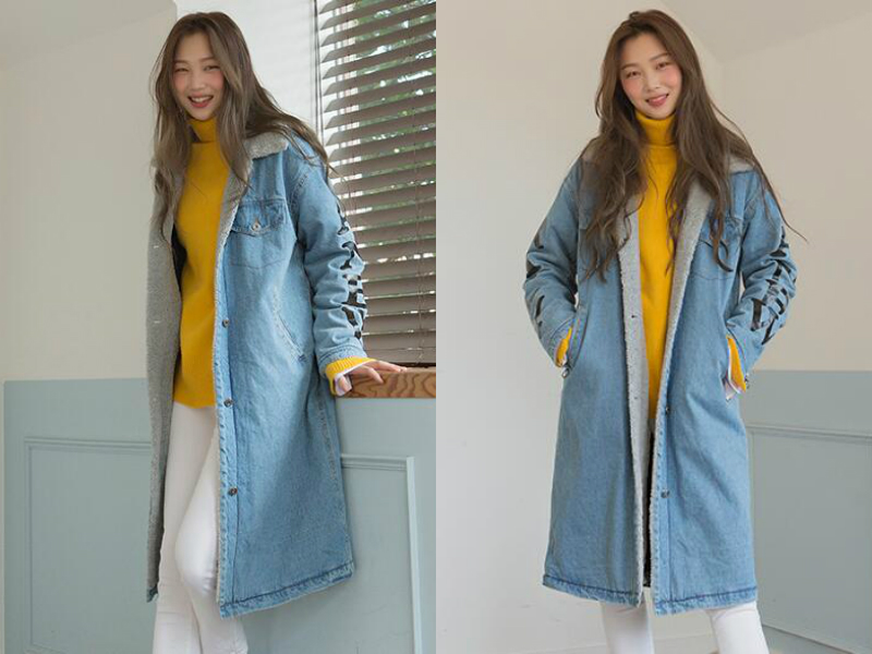 超长的一款韩版牛仔外套,下摆长至小腿,加上直筒的版型,瞬间拉高显瘦。领子是如棉花糖般柔软的羊羔绒毛领,保暖又容易打理,袖子上的英文字母印花时尚有个性,袖口收紧防风效果佳。