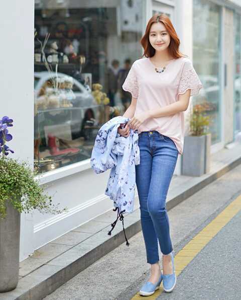 胖人夏天穿衣搭配推荐6、喇叭袖T恤+修身牛仔裤