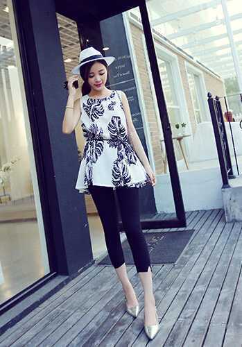 胖人夏天穿衣搭配推荐4、印花无袖背心+黑色打底裤
