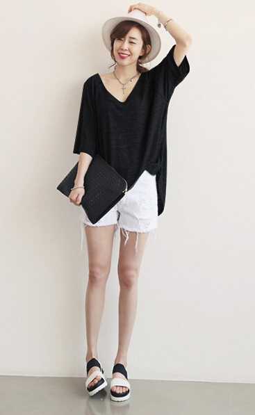如果你喜欢简约休闲风,那这身经典的黑白配搭非常适合你呢。V领的T恤能起到很好的拉长颈部线条效果,再将衣摆随意的塞进热裤里,显瘦之余潮味十足。