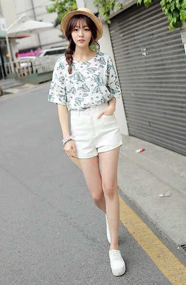 胖人夏天穿衣搭配推荐1、高腰短裤+宽松印花短袖T恤