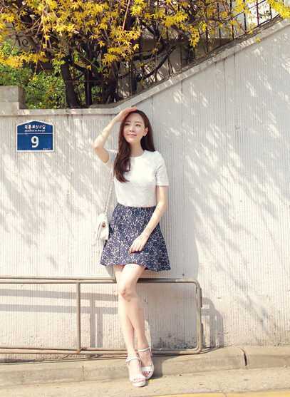 高腰裙也是修腰型的一大利器,加上裙身印花的元素设计更是立显时尚甜美,再配搭修身的短袖T恤,这样的一身真是非常气质淑女呢!