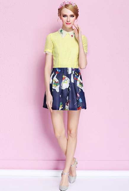 像这款上身暖色系+下身冷色系+中间色系配搭的连衣裙的就非常适合东方女性,明黄色的上衣很衬肤色,冷色系的蓝紫色的裙子与暖色系的上衣非常搭,鞋子选色中间色系的灰色,显得非常大方典雅,头上粉色的发饰则起到点缀的作用。