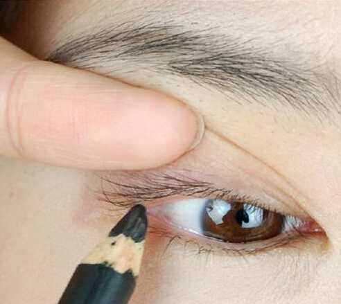 step 4:用手指将眼皮稍向上提拉,然后从眼尾至眼中画眼线,再从眼中到眼头画眼线,在眼尾的部分稍微向上扬。