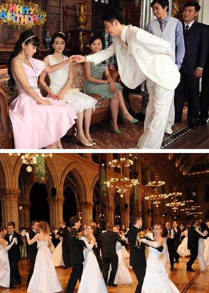 女士的着装比较繁琐,适宜穿裙摆较大的、长及脚踝的一些裙子。因多数的舞会都在晚间举行,因此女士在妆容上,通常以晚妆为宜,同时还要搭配上五光十色的首饰与精美的发型,头发最好盘起来,梳成发髻。在社交舞会中,晚礼服裙是最适合女