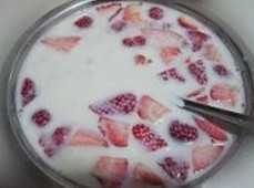 4、把草莓去叶,对半切开或切片,再放入西米里。