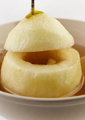 2、把雪梨的果核挖出来,顶部留着当雪梨盅的盖子。