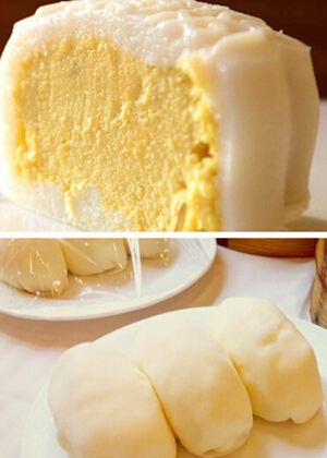 4、取一块糯米块,揉圆压扁,然后放入榴莲肉和淡奶油,再搓成圆形,然后撒上一层糕粉,再放入冰箱里冷藏十五分钟,即可食用。