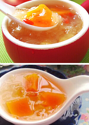 银耳含有大量胡萝卜素,有助于保持皮肤润泽细嫩,增强皮肤张力、消除皱纹的功效,看看这道奶香木瓜银耳羹怎么做。