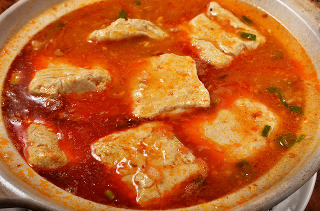 做法:把豆腐放入水中浸泡十分钟,然后捞出切厚方块,在锅里放水烧开,然后放入豆腐焯水捞出备用,把葱切段,在炒锅里放油烧热,放入葱、辣椒酱和豆瓣酱炒香,然后放入少许水、酱油和盐煮开,再放入豆腐煮至汁变浓稠,再用淀粉勾芡即可,香辣的红烧豆腐就做好了。