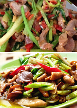 原料:鸡杂500克(包括鸡胗、鸡肠、鸡心、鸡肝等),香芹200克