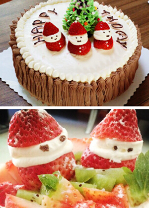8、然后取两颗芝麻放上去做成雪人的眼睛,分别用奶油点一下草莓的顶部和肚子(做成帽子和纽扣),这样,圣诞雪人就出来啦。