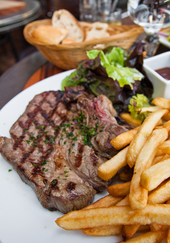 8、等西红柿炒成糊状时,加入土豆丁,继续放盐、糖和黑胡椒翻搅,煮一会即可,再倒入牛排,最后装盘,摆上西兰花就完成了。