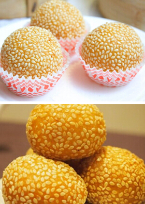 4、待凉后,重复以上步骤重新油炸3遍,使之膨胀到球般大小即可。想吃更美味的煎堆,可以在制作的时候放进美味的馅料。