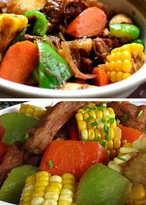 原料:猪小排,土豆,茄子,玉米,茭白,胡萝卜,洋葱,尖椒