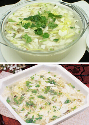 1、将整块豆腐放入冷水锅中煮至微沸,以去除豆腥黄浆水,捞出后片成雀舌形,放入热鸡汤中。