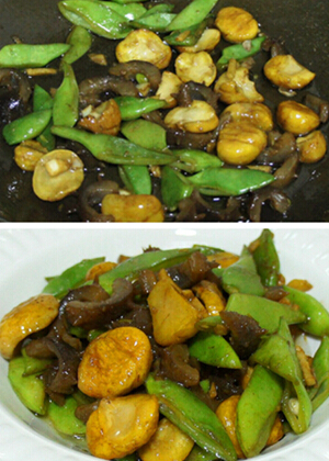 6、再加入炒好的油豆板栗,倒入少量高汤,煨至收汁,再用水淀粉勾芡,加盐调味即可。
