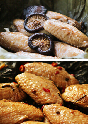 2、最后将香菇垫底,鸡翅在上这样放入泡好的荷叶内,再将熬好的豆鼓汁浇在鸡翅上包好,放入蒸箱蒸30分钟便可。
