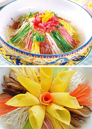 2、将绿豆面压细与萝卜丝拌匀,用旺火煮5分钟取出,晾凉后投入清水内用手拨散,然后蒸透待用(即为“燕菜”)。