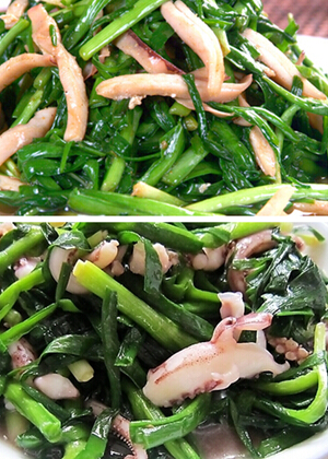 小贴士:鱿鱼用水焯一下可以保持鱿鱼的口感和造型,不用切太大片。