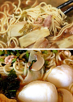 4、炒锅内放一半烧好的笋片肉片加水烧开,加面条,开了后盛出,放入碗中加炒好的雪菜笋片做料,撒葱段即可。