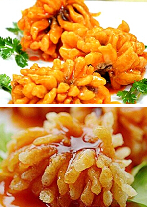 4、锅里放油烧热,放入冬瓜,小火炸至金黄色,捞出,这时一朵一朵的冬瓜花金灿灿的,美丽极了。