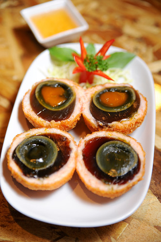 材料:猪肉末200g,鸡蛋6个,白洋葱半个,蛋液,面粉,面包糠各适量。