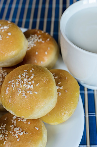 做法:将酵母加入温水搅拌放置五分钟,把面粉倒进盘里,在中间挖一个洞,把鸡蛋打进去,加入盐、酵母水和糖,揉成面团,再加入黄油,揉成光滑面团,留在盘里发酵至原来的两倍大,把面团分别捏成大小一样的小丸子,再放在案板上发酵十五分钟,然后,把小丸子包入芝麻,再擀长用刀斜切几下,然后反过来卷起,两边口对捏紧,在平底锅里放油,把做好的小面包放进去煎至底部微黄,加少量的水,烧干后再煎两分钟,就可以了。