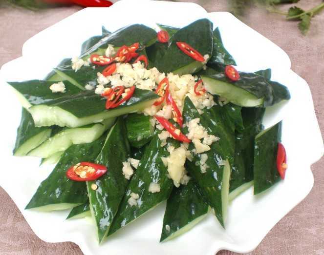 2、把黄瓜放入大碗里,加入盐、味精、葱和少许蒜腌十分钟,然后倒掉水,在锅里放油烧热,炒香蒜,加入醋,再加入 辣椒炒出红油,装盘待放凉后,再淋在黄瓜上面,凉拌黄瓜就搞定了。