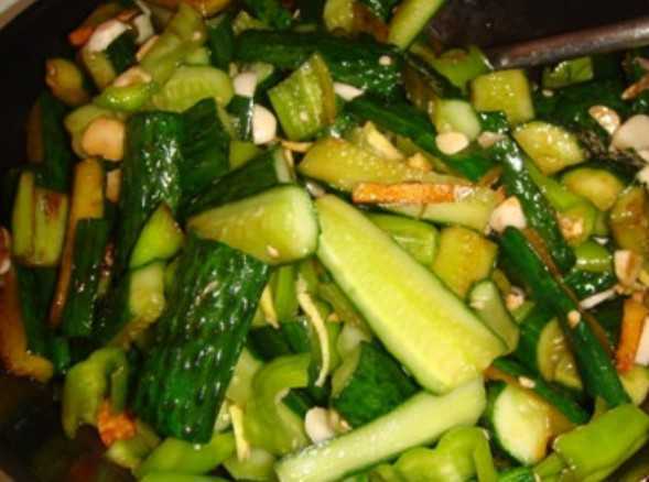 1、把黄瓜洗干净,切成条,加入盐拌匀,放入底部有洞的容器里,上面放入重物压6小时,直至黄瓜软。