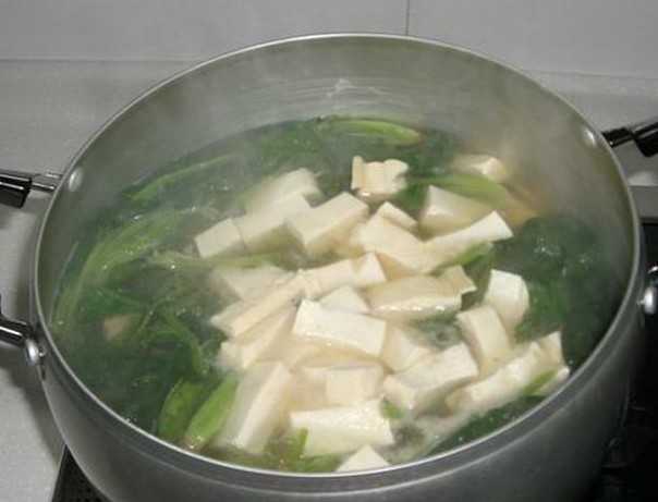 3、在另一个锅里放入清水煮开,然后放入豆腐煮一分钟,再放入菠菜煮开,然后关火,加入盐和植物油调味即可,营养丰富的菠菜豆腐汤就做好了。