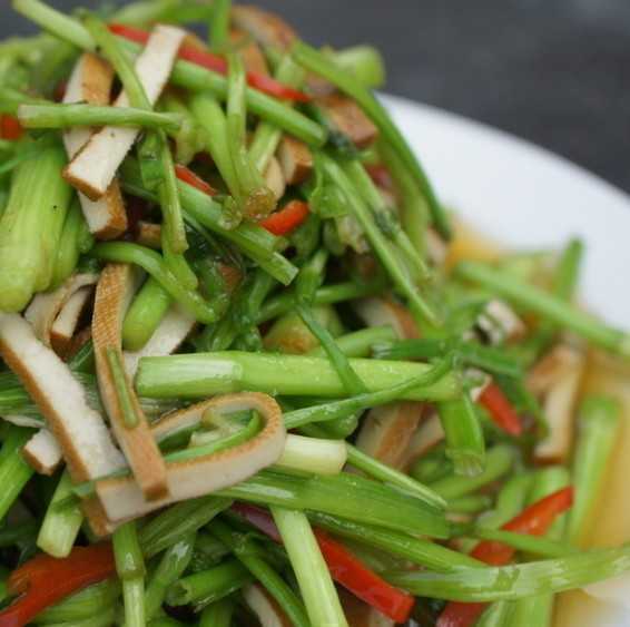 做法:把芹菜洗干切段,放入沸水中焯两分钟,捞出沥干水,红椒去籽切丝,豆干洗干净切成厚片,葱切碎,在锅里放油烧热,炒香葱后,再放入芹菜炒一分钟左右,然后放入豆干和红椒,加入盐翻炒两分钟,最后,加味精调味即可,豆干炒芹菜就可出锅了。